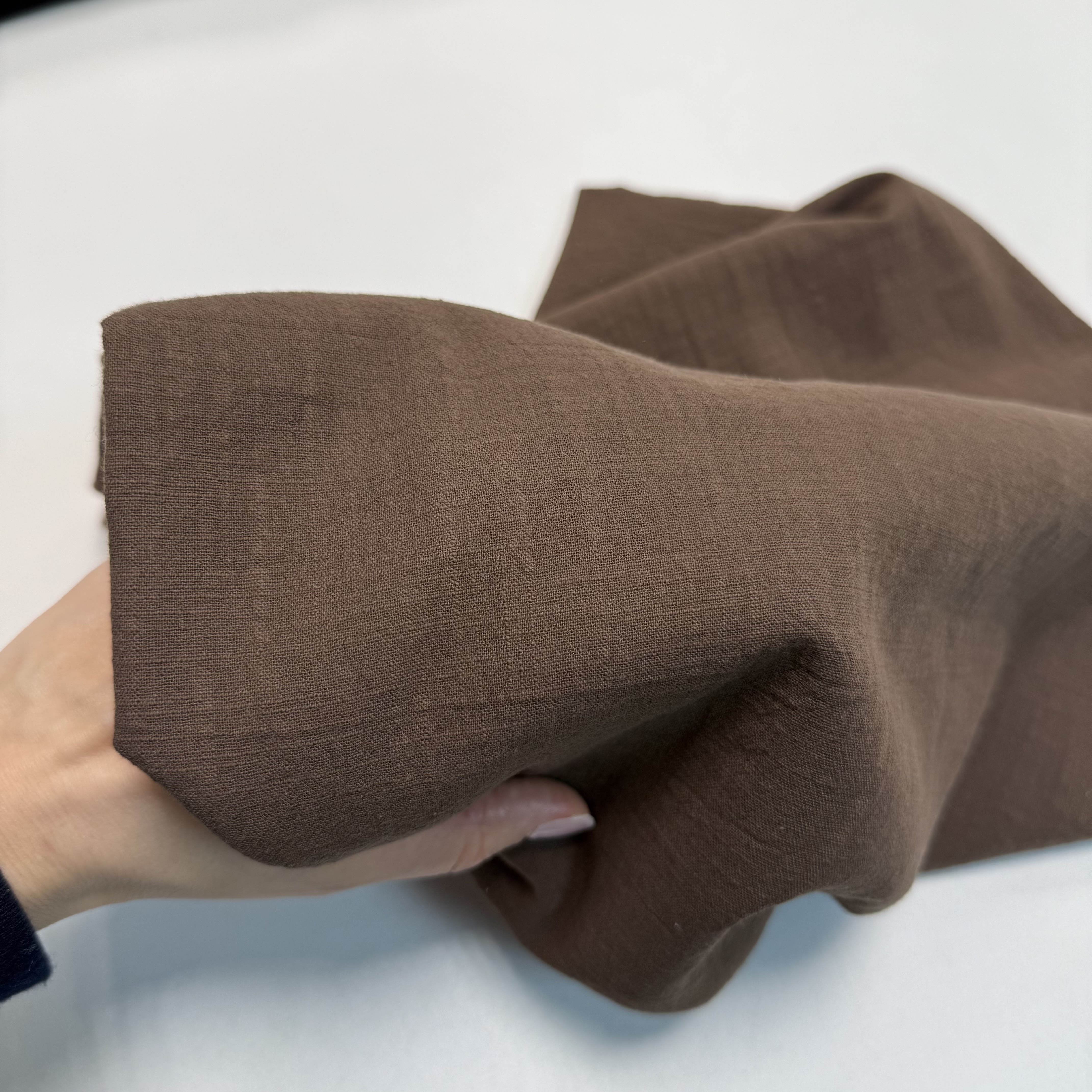 На такни возможны единичные небольшие вкрапления нитей другого цвета. Это не считается дефектом или браком для данного вида ткани. Ткани рвем строго по нити, если сложить отрез вдвое, то возможны отклонения от прямой до 5см. Это связано с фабричной намоткой ткани в рулон, после стирки отрез становится ровным.