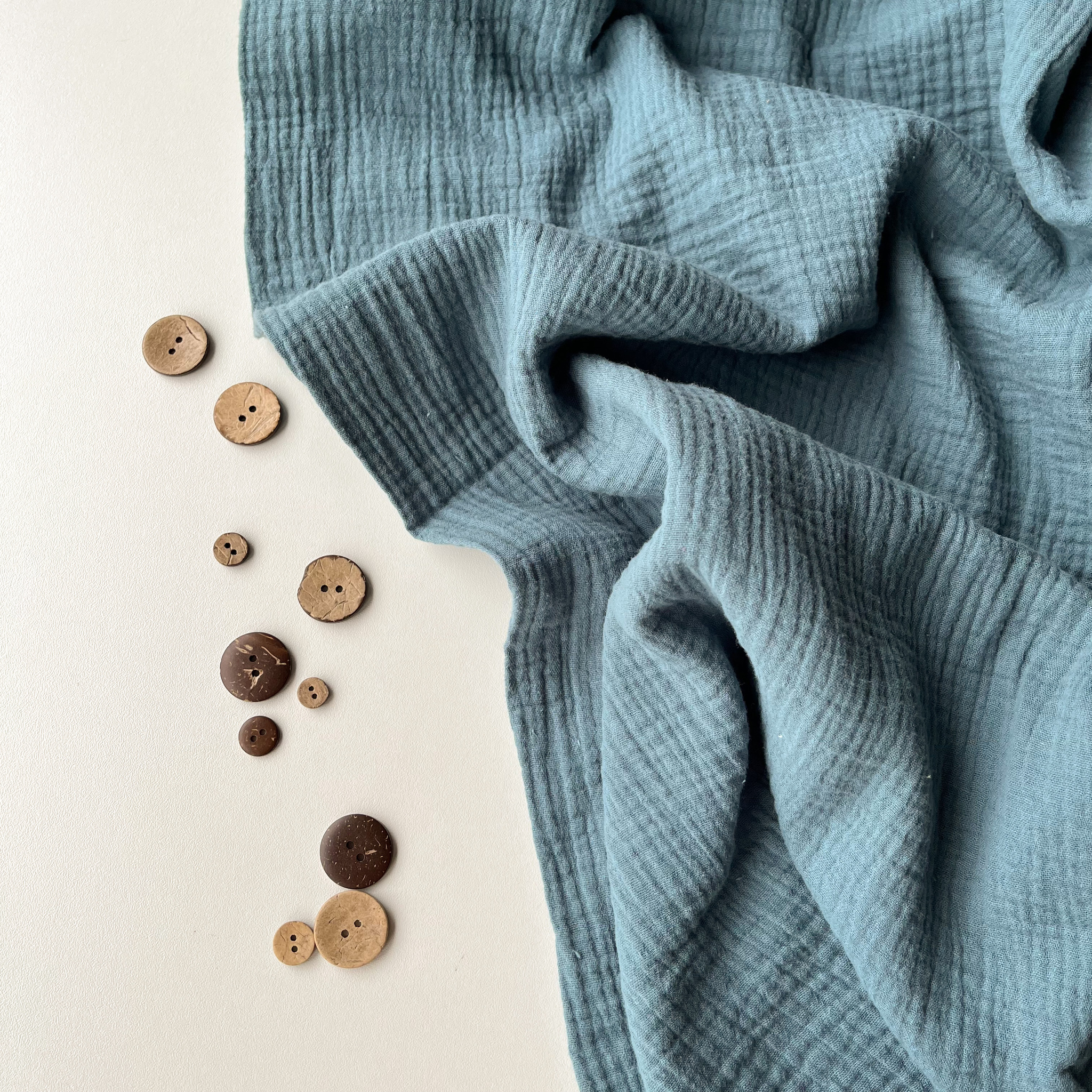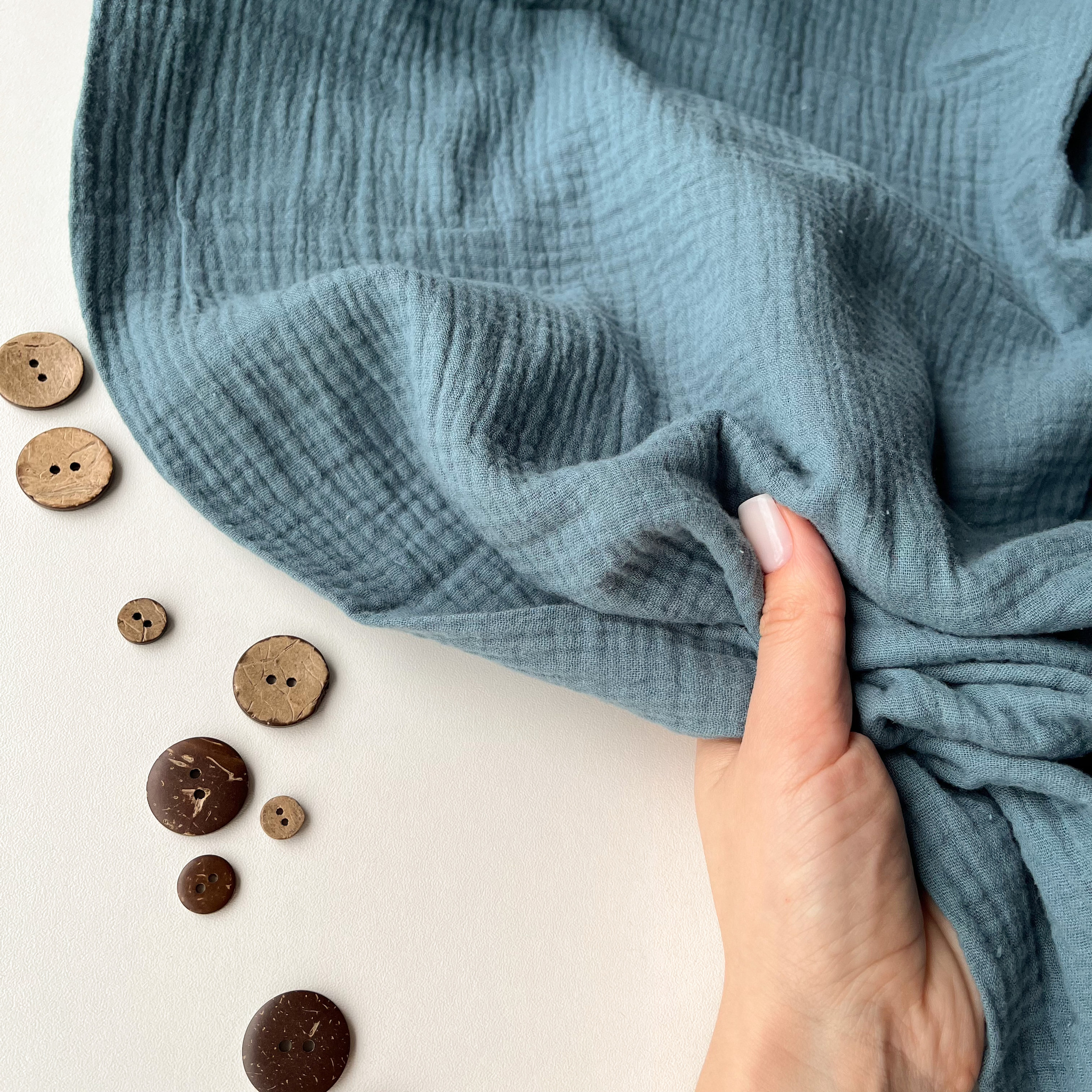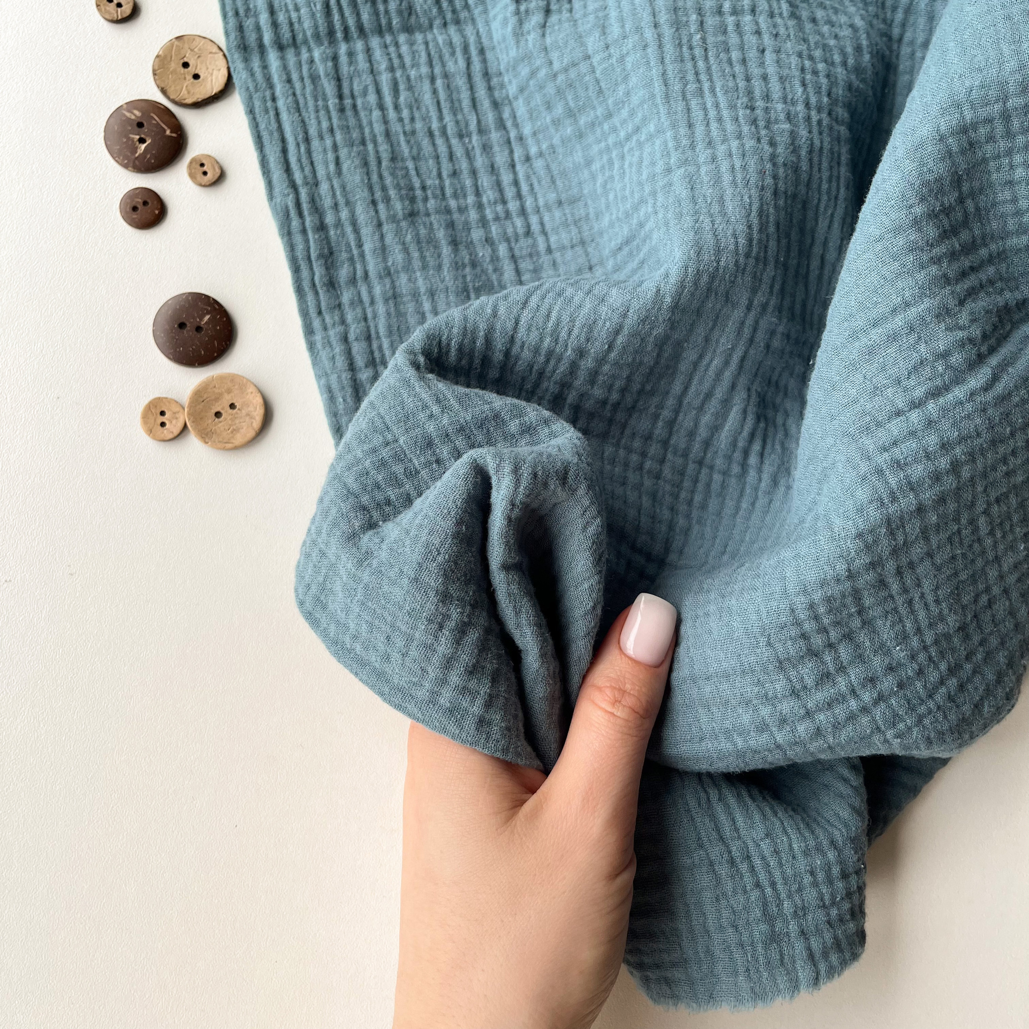 Ткань состоит из двух переплетенных между собой слоев муслина, имеет рыхлую объёмную фактуру с эффектом жатости. На ощупь мягкая, пластичная. Гигроскопична и гипоаллергенна. Светлые цвета могут слегка просвечивать. Подойдёт для пошива взрослой и детской одежды, домашнего текстиля, детских пеленок и пледов.