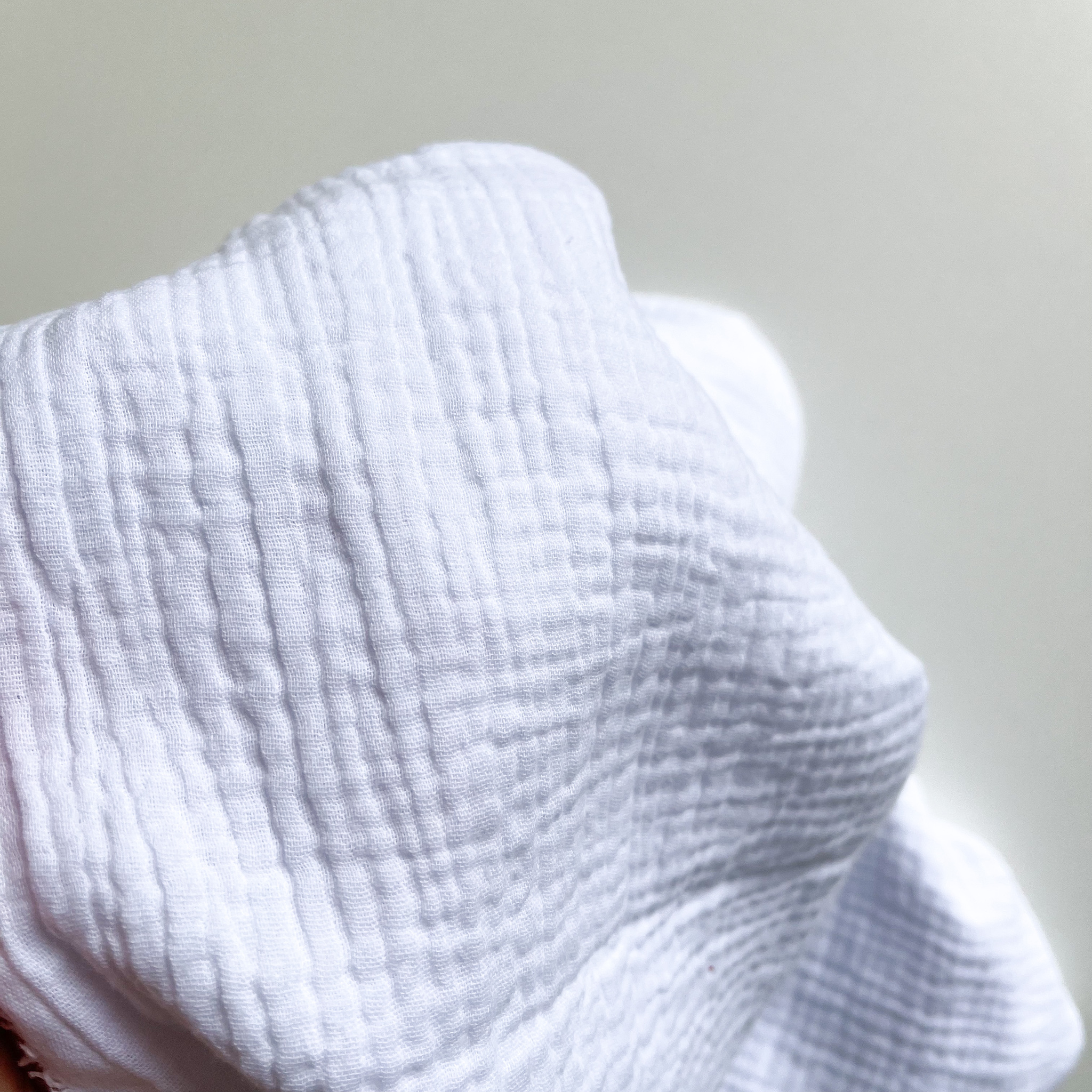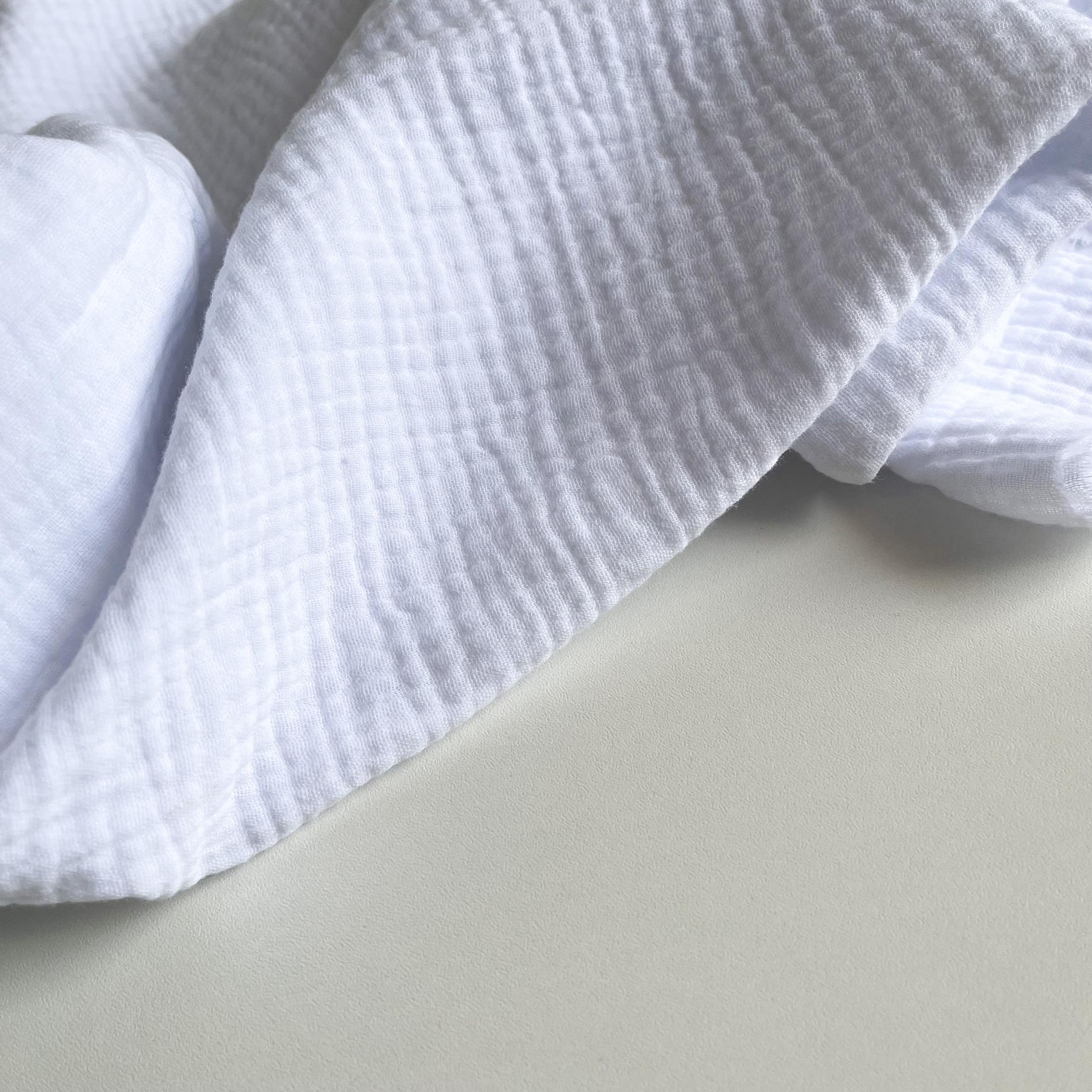 Ткань состоит из двух переплетенных между собой слоев муслина, имеет рыхлую объёмную фактуру с эффектом жатости. На ощупь мягкая, пластичная. Гигроскопична и гипоаллергенна. Светлые цвета могут слегка просвечивать. Подойдёт для пошива взрослой и детской одежды, домашнего текстиля, детских пеленок и пледов.