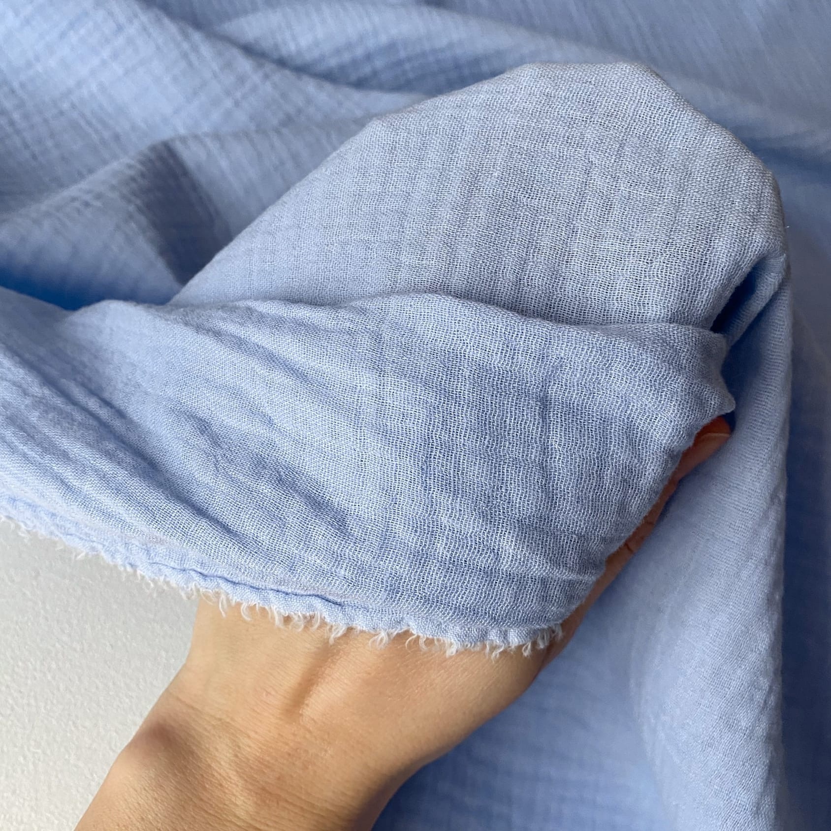 Ткань состоит из двух переплетенных между собой слоев муслина, имеет рыхлую объёмную фактуру с эффектом жатости. На ощупь мягкая, пластичная. Гигроскопична и гипоаллергенна. Светлые цвета могут слегка просвечивать. Подойдёт для пошива взрослой и детской одежды, домашнего текстиля, детских пеленок и пледов.