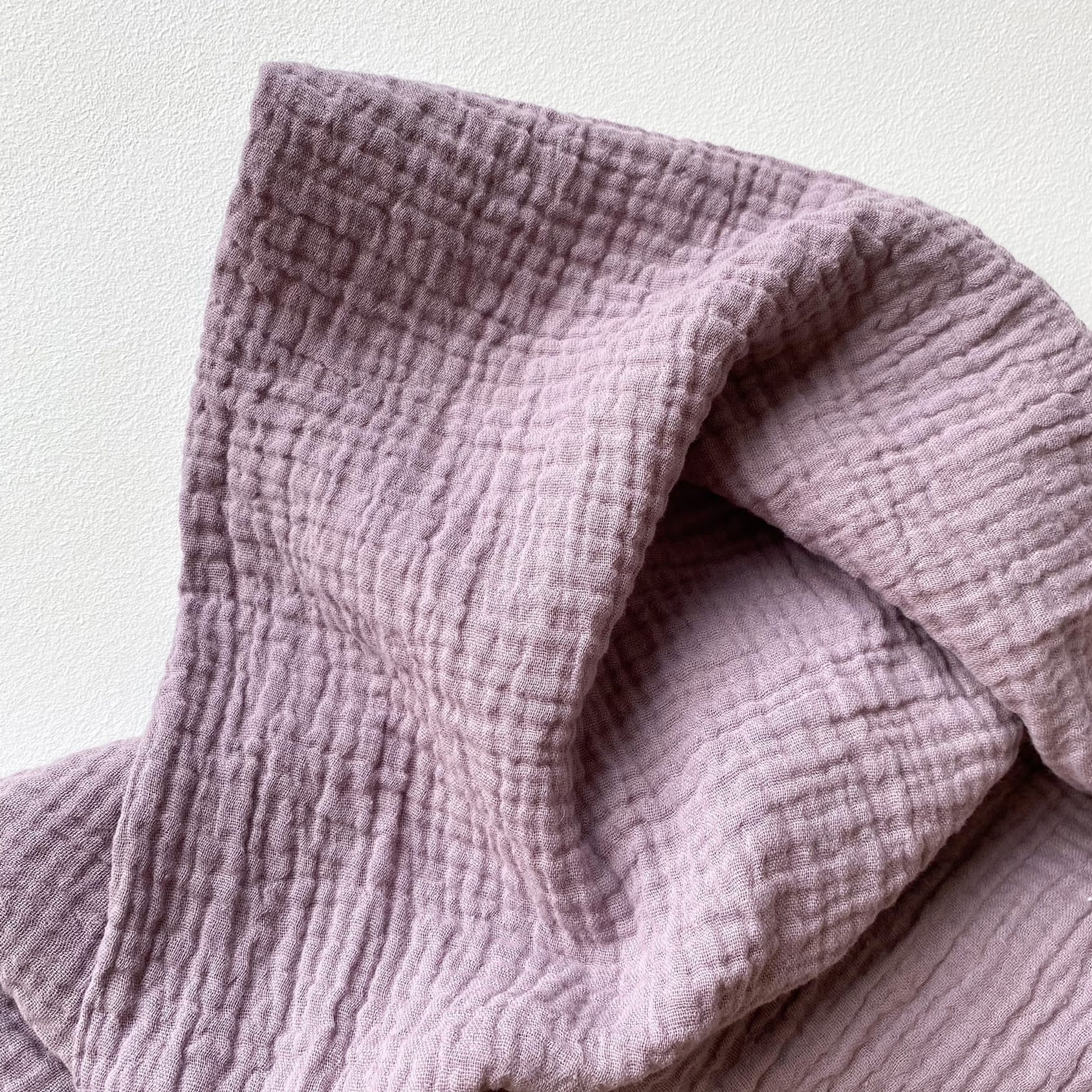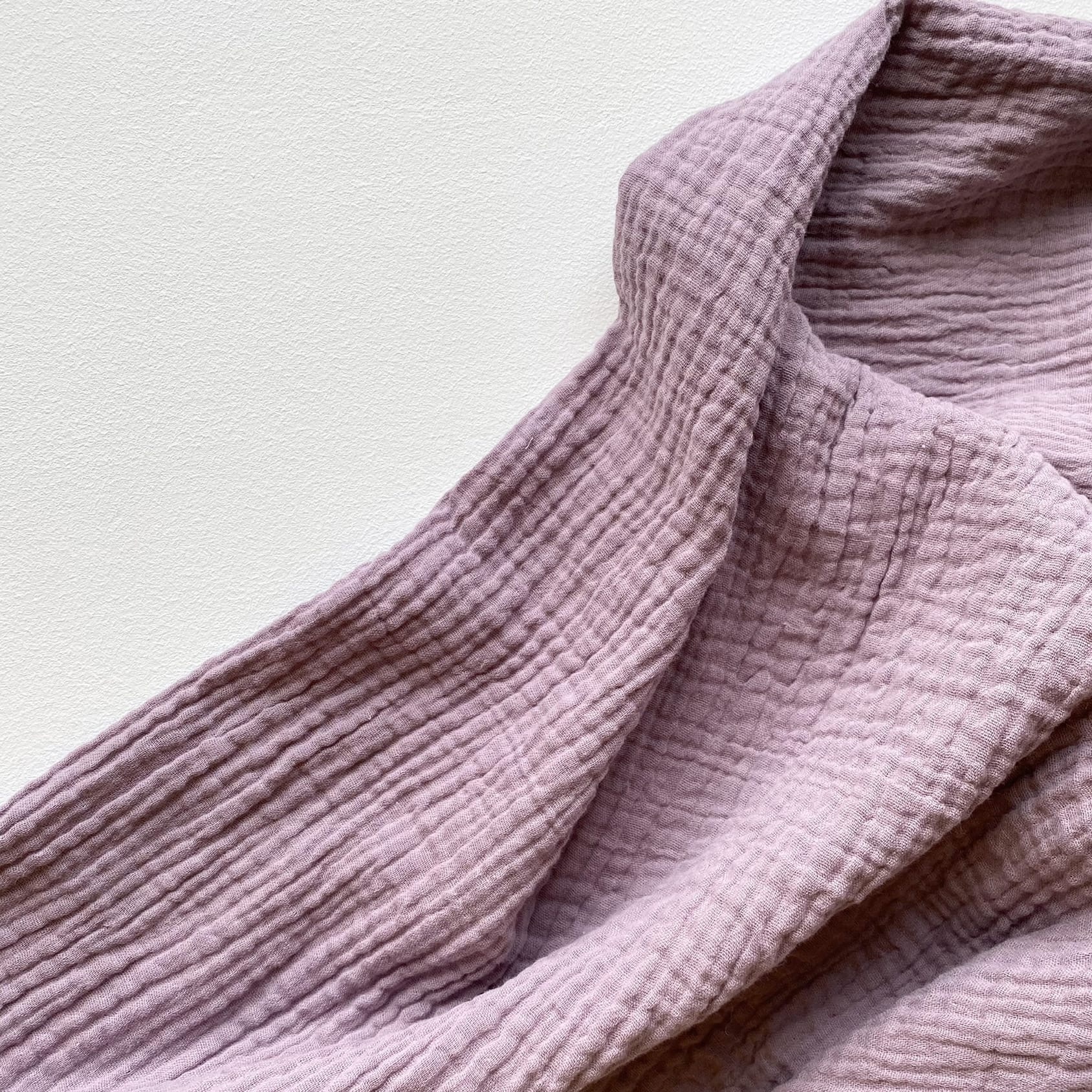 Ткань состоит из двух переплетенных между собой слоев муслина, имеет рыхлую объёмную фактуру с эффектом жатости. На ощупь мягкая, пластичная. Гигроскопична и гипоаллергенна. Светлые цвета могут слегка просвечивать. Подойдёт для пошива взрослой и детской одежды, домашнего текстиля, детских пеленок и пледов.