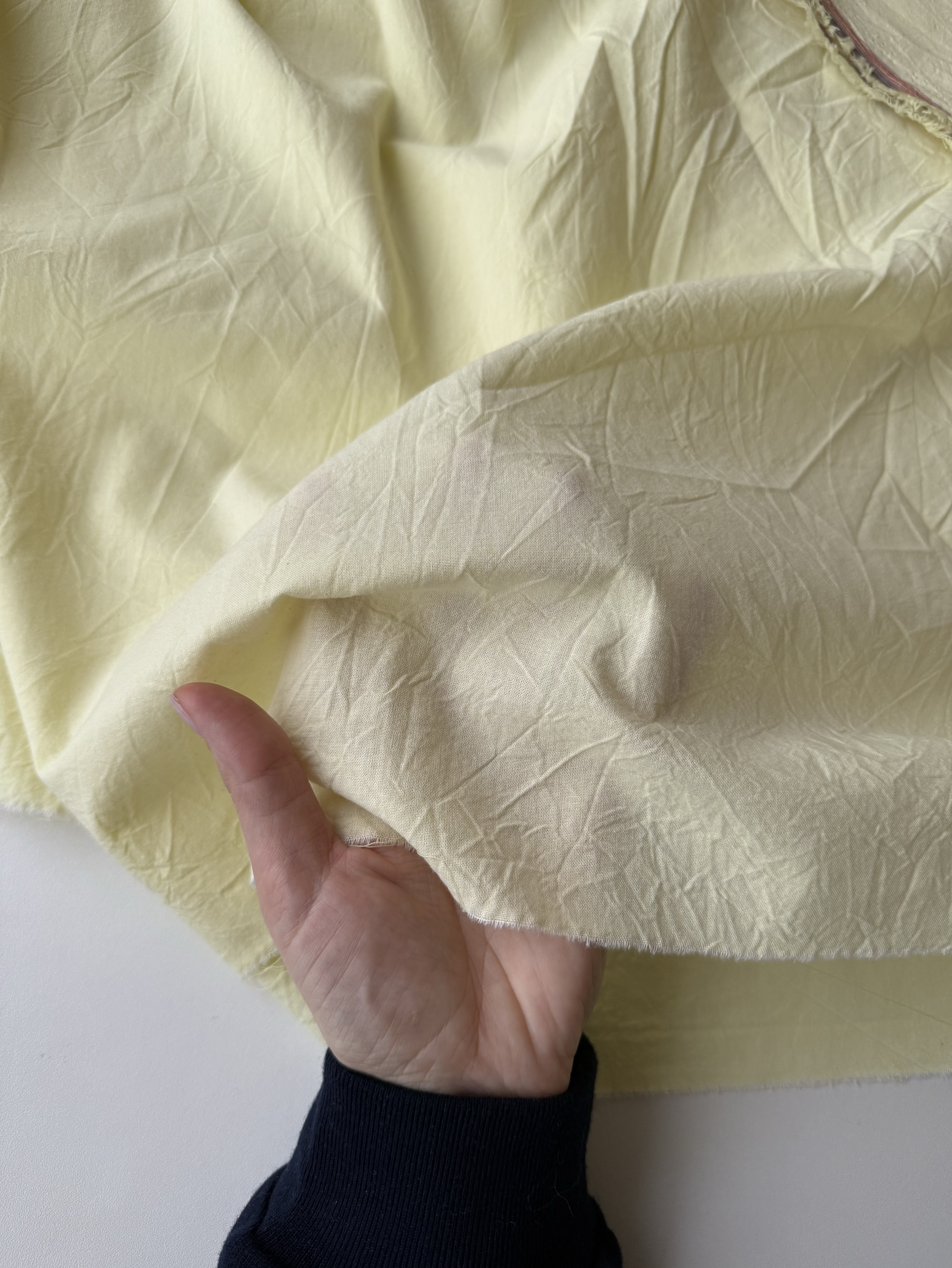 На такни возможны единичные небольшие вкрапления нитей другого цвета. Это не считается дефектом или браком для данного вида ткани. Ткани рвем строго по нити, если сложить отрез вдвое, то возможны отклонения от прямой до 5см. Это связано с фабричной намоткой ткани в рулон, после стирки отрез становится ровным.